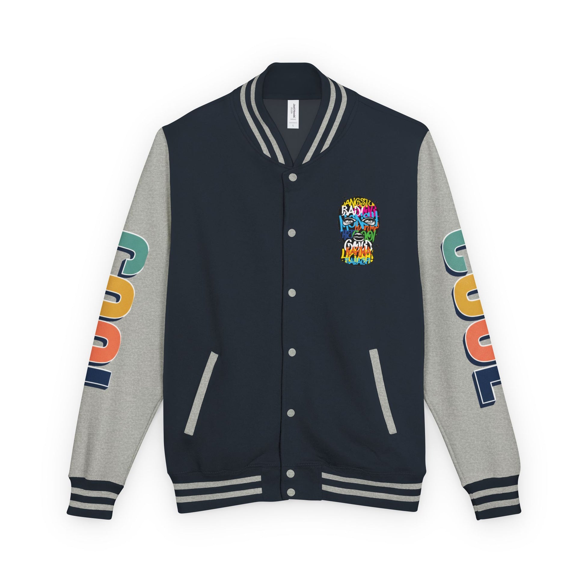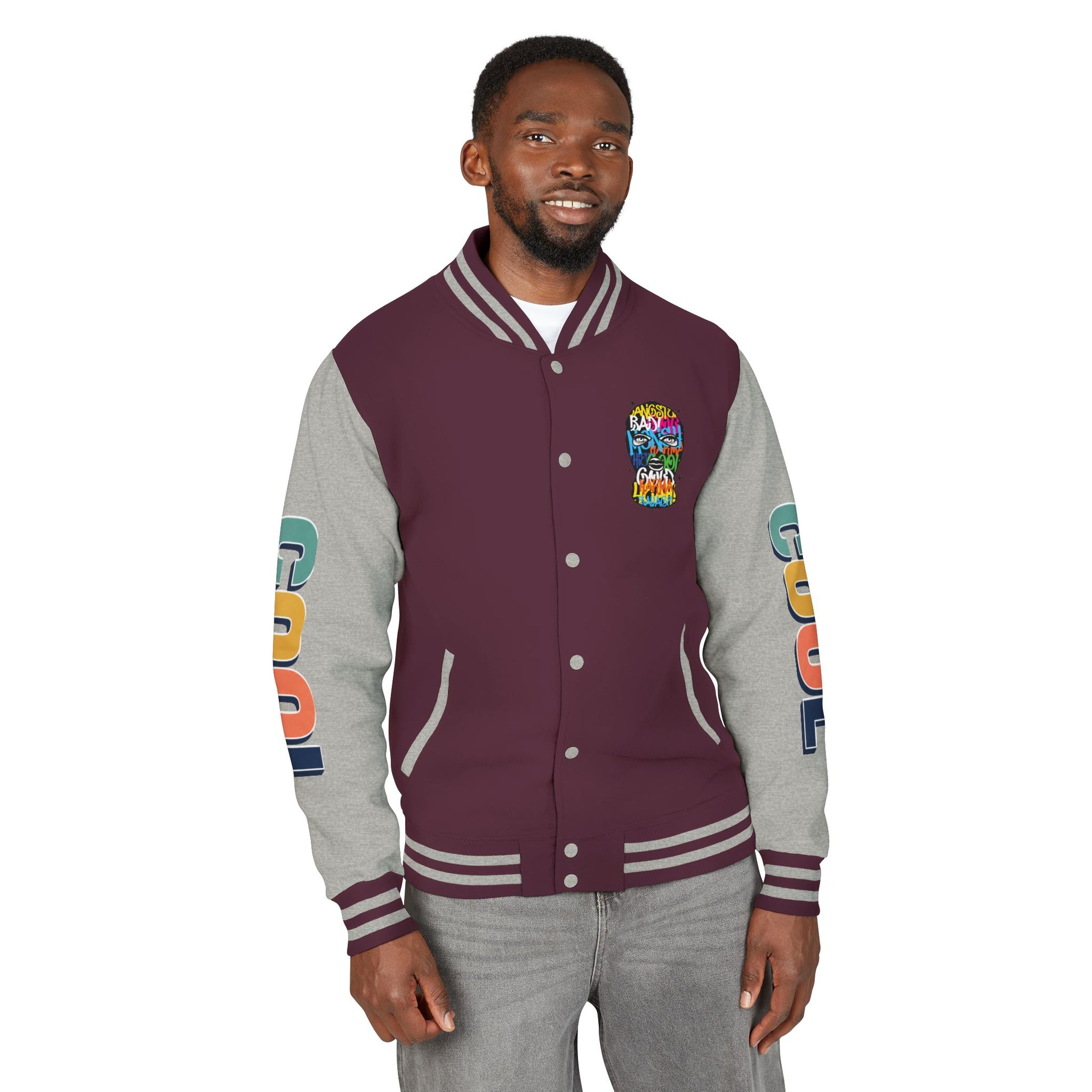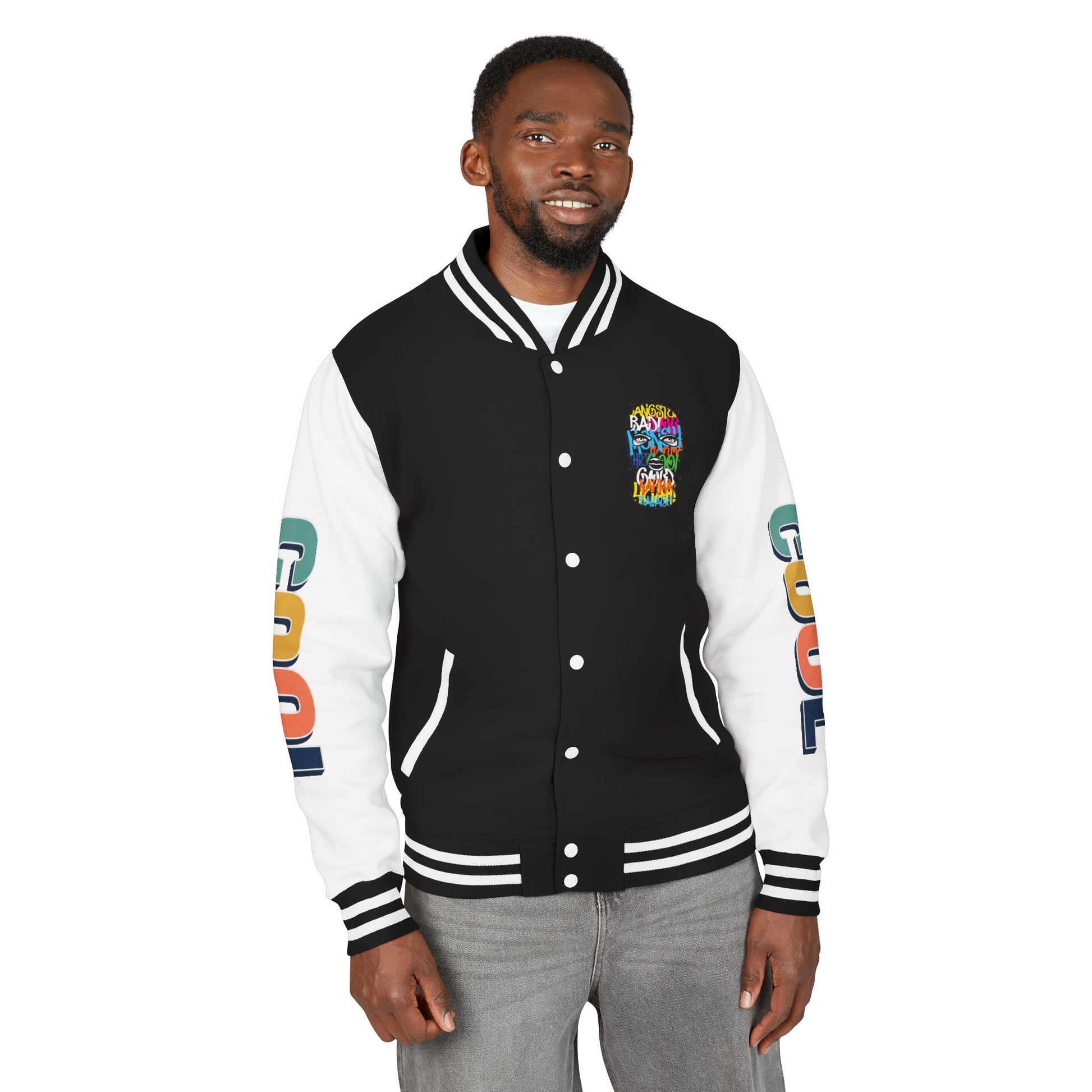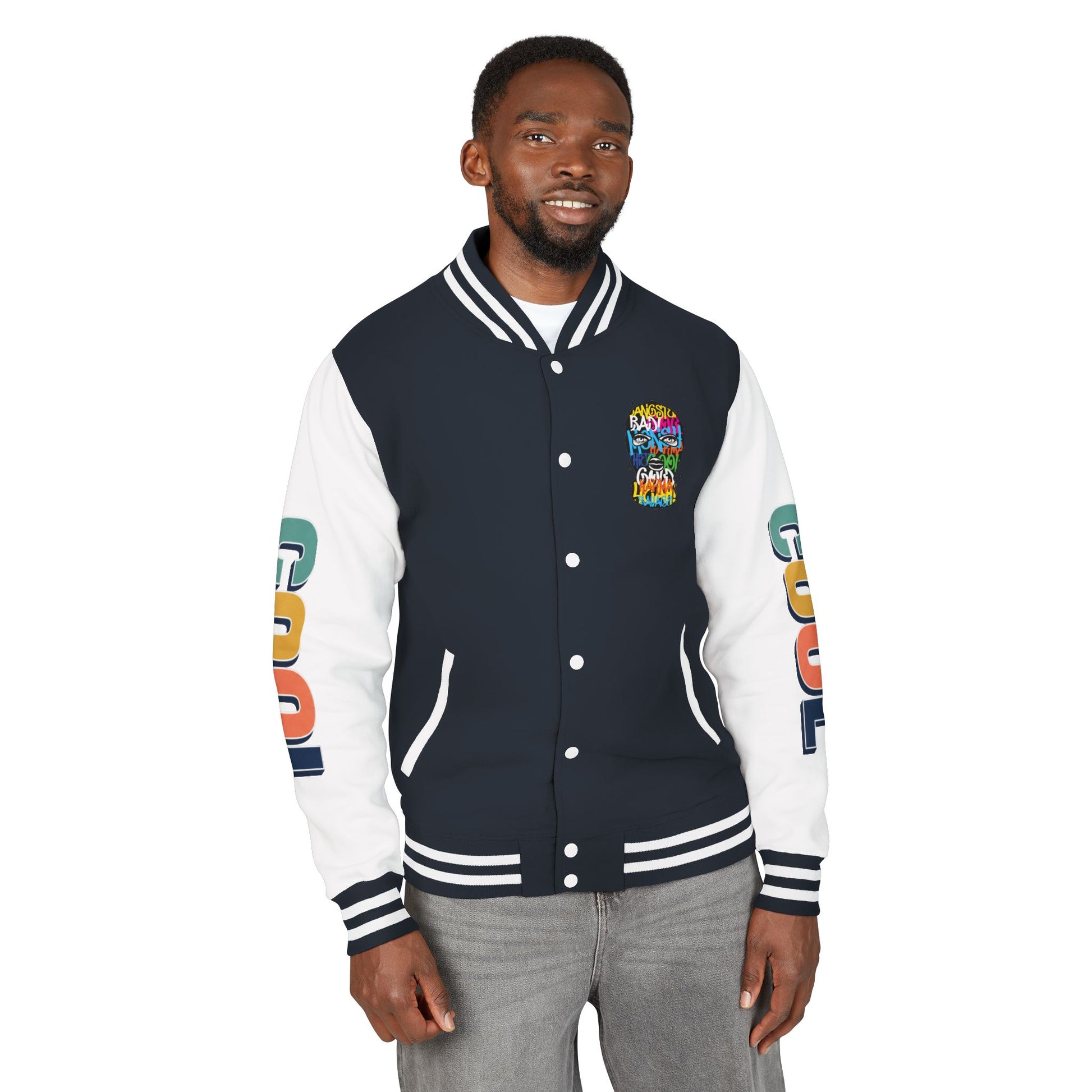 - Classic varsity details: snap front, striped ribbing, front pockets, bold sleeve and back prints