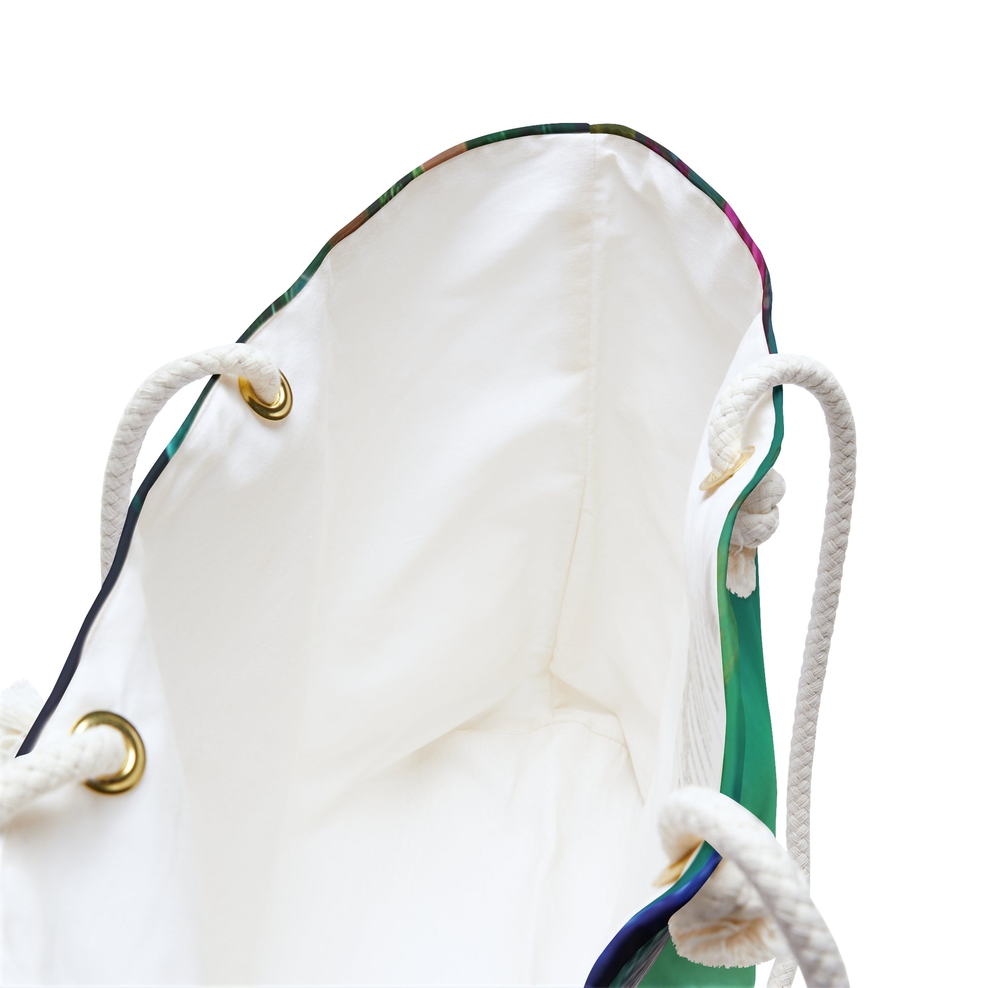 A roomy, artful weekender that carries the calm of a secret garden. The vivid peacock print blurs into jewel-toned greens and teal, turning simple travel into a quietly theatrical moment. Lightweight spun polyester holds shape without wrinkling, while the cream rope handles and gold grommets add a tactile, nautical touch. Inside, a soft cream sheeting lining keeps belongings protected and easy to find. The wide T-bottom gives structure for packing clothing, a sweater, or a small picnic; it moves effortlessly from morning markets to late-afternoon train cars. Hand it over your shoulder and you’ve got a reliable companion that reads like a storyteller—colorful, composed, and a little bit whimsical.